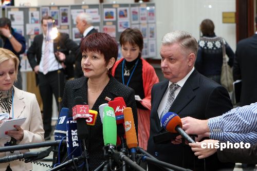 圖為俄中選委成員安娜·庫利亞索娃和俄聯(lián)邦移民局官員康斯坦丁·羅莫丹諾夫斯基,向媒體介紹國家杜馬選舉的進(jìn)展情況。