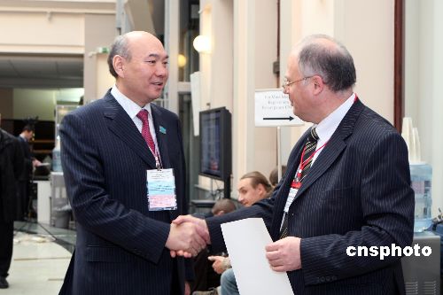 圖為哈薩克斯坦議會(huì)副議長、獨(dú)聯(lián)體國家議會(huì)組織觀察團(tuán)協(xié)調(diào)人茹馬古洛夫(左),會(huì)見俄中央選舉委員會(huì)成員。