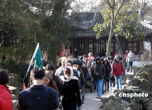 12月30日,游客在蘇州古典園林拙政園游覽。當(dāng)日是2008年元旦“小長(zhǎng)假”第一天,盡管蘇州天氣寒冷,但姑蘇園林內(nèi)人氣依然火爆。中新社發(fā) 王建康 攝