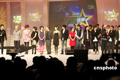 一月三日晚,Road Show至尊音樂頒獎(jiǎng)禮2007在香港會(huì)展中心舉行,香港幾乎所有大小音樂明星都到場出席。古巨基、劉德華、李克勤獲至尊男歌手獎(jiǎng),容祖兒、何韻詩、楊千嬅獲至尊女歌手獎(jiǎng),另還有數(shù)十項(xiàng)音樂獎(jiǎng)項(xiàng)同時(shí)頒獎(jiǎng)。中新社發(fā) 王麗南 攝