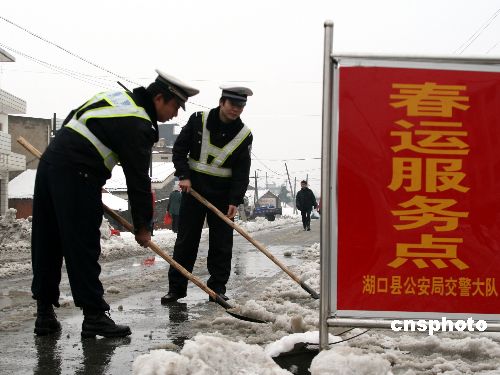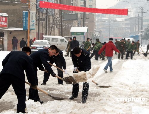12月28日晚,江西省北部的湖口縣迎來入冬以來最大的一場(chǎng)雪。據(jù)悉,該縣已經(jīng)連續(xù)六天發(fā)布道路結(jié)冰紅色預(yù)警信號(hào),所有道路凝冰嚴(yán)重。1月29日,凝冰未化又遇小到中雪,通行能力受到挑戰(zhàn)。該縣民警、消防戰(zhàn)士、駐地部隊(duì)官兵、民兵應(yīng)急隊(duì)員和廣大黨員干部群眾二萬(wàn)余人上街清掃積雪和凝冰,盡最大努力減少災(zāi)害損失。中新社發(fā) 張 俊 攝