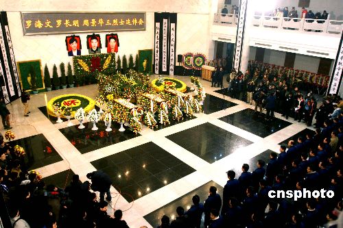為保護(hù)湖南電網(wǎng)而犧牲的湖南電力公司羅海文、羅長明、周景華三烈士追掉會(huì),1月30日在長沙陽明山殯儀館舉行,上千群眾前往悼念。湖南省委常委、長沙市委書記陳潤兒,省人大常委會(huì)副主任陳叔紅,省人民政府副省長陳肇雄,省政協(xié)副主席陽寶華,省軍區(qū)副政委萬建華等省領(lǐng)導(dǎo)前往悼念。圖為湖南各界沉痛悼念抗冰保電的三位烈士。中新社發(fā) 殷中民 攝
