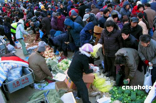 圖:南方雪災(zāi)影響食品價(jià)格 北京早市人頭攢動(dòng)