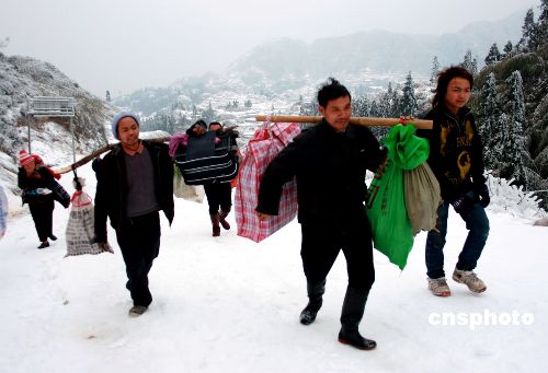 近一個月來,廣西融水縣遭受當?shù)亟?7年來最嚴重的雨雪冰凍災害,在海拔1470米的摩天嶺,冰雪封凍導致交通中斷,當?shù)刂泄颤h員每天為過往災民義務帶路和挑擔,幫助他們翻越冰雪覆蓋的摩天嶺,安全回家。中新社發(fā) 張耀華 攝