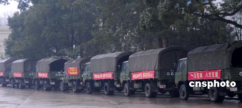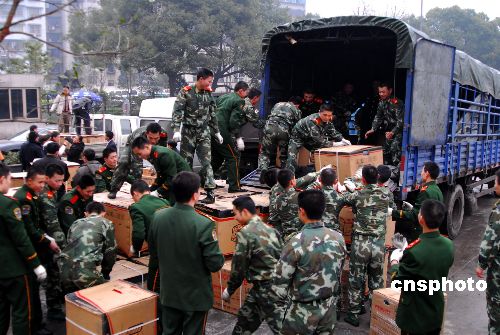 2月4日,雪凝天氣尚未結束,貴陽地區(qū)又飄起了毛毛細雨,在省政府廣場上,武警戰(zhàn)士在裝運重慶等省市支援貴州的救災物資和小型發(fā)電機,準備運往此次雪災中受災嚴重的黔東南、黔南、銅仁、畢節(jié)等地區(qū)。此次持續(xù)20多天的雪凝凌凍天氣,使貴州省70多個縣市受災嚴重,部分縣市停水斷電已近20天。中新社發(fā) 歐陽昌佩 攝