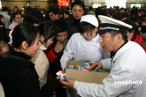 持續(xù)的大范圍災(zāi)害性雨雪天氣給回鄉(xiāng)過春節(jié)的旅客帶來不便。2月5日,中國海軍上海保障基地派出醫(yī)療隊(duì),冒著嚴(yán)寒來到上海火車站免費(fèi)為旅客送醫(yī)送藥。中新社發(fā) 穆東祥 攝