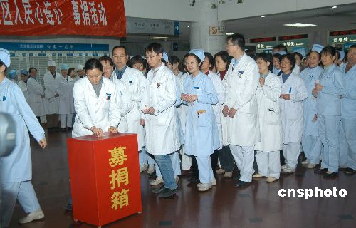 二月五日,北京世紀(jì)壇醫(yī)院職工排隊(duì)為受災(zāi)的南方省、市衛(wèi)生廳、局捐款。北京衛(wèi)生局四日向全市衛(wèi)生系統(tǒng)發(fā)出緊急通知,號(hào)召廣大醫(yī)務(wù)人員向冰雪災(zāi)區(qū)緊急捐款。據(jù)不完全統(tǒng)計(jì),截止五日,已累計(jì)捐款四百一十八萬八千元人民幣。這是北京衛(wèi)生系統(tǒng)近年來在捐款活動(dòng)中,時(shí)間最短、數(shù)量最多的一次。中新社發(fā) 曾利明 攝