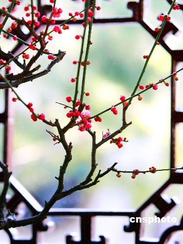 春節(jié)黃金周以來(lái),古城蘇州陽(yáng)光明媚,天氣持續(xù)晴好,蘇州古典園林獅子林正在舉辦的“迎春梅花展”上的眾多紅梅、綠梅及老梅樁盆景紛紛提前綻放,吸引了許多新春游園的市民和中外游客觀賞,讓人們感受到梅花飄香的早春氣息。中新社發(fā) 蘇秀 攝