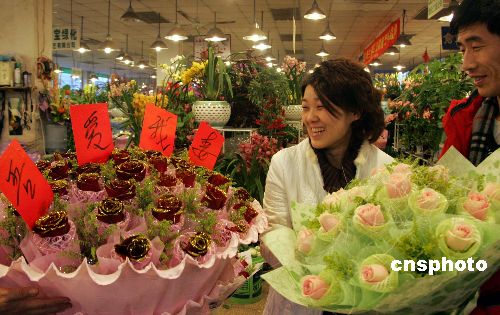 二月十三日,形形色色的口彩玫瑰亮相上海情人節(jié)花市。圖為逛花市的女性面對(duì)由五十七朵玫瑰組成的諧音“吾愛我妻”口彩玫瑰開心不已。中新社發(fā) 潘索菲 攝