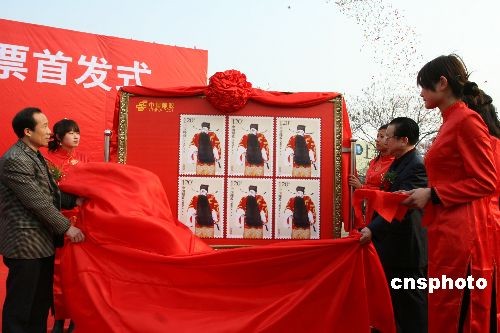 2月23日,《京劇凈角》曹操特種郵票在河南許昌首發(fā)!毒﹦艚恰诽胤N郵票一套6枚,為徐彥昭、包拯、廉頗、張飛、曹操、楊延嗣6位人物的京劇傳統(tǒng)劇目典型形象,此套郵票是繼《京劇生角》、《京劇旦角》、《京劇丑角》特種郵票之后發(fā)行的最后一套京劇題材類郵票。這套郵票的發(fā)行,將對弘揚傳統(tǒng)文化、振興京劇藝術(shù)起到推動作用。 中新社發(fā) 牛書培 攝