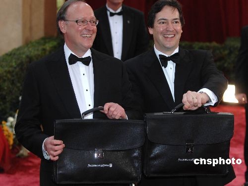 當(dāng)?shù)貢r(shí)間2月24日晚,第八十屆奧斯卡頒獎(jiǎng)典禮在好萊塢柯達(dá)劇場舉行。在奧斯卡金像獎(jiǎng)?lì)C獎(jiǎng)典禮開始前,美國普華永道會(huì)計(jì)事務(wù)所的兩位會(huì)計(jì)師布萊德(左)和瑞克向記者展示兩個(gè)公文包,這里裝的就是奧斯卡各獎(jiǎng)項(xiàng)的最終結(jié)果。兩位會(huì)計(jì)師是最早知道奧斯卡結(jié)果的人。中新社發(fā) 張煒 攝