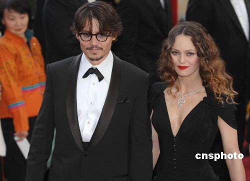 當(dāng)?shù)貢r(shí)間2月24日晚,第八十屆奧斯卡頒獎(jiǎng)典禮在好萊塢柯達(dá)劇場(chǎng)舉行。影帝提名人、《理發(fā)師陶德》主演約翰尼·德普未能如愿。圖為約翰尼·德普攜女友維尼莎·帕萊茲準(zhǔn)備出席頒獎(jiǎng)禮。中新社發(fā) 張煒 攝