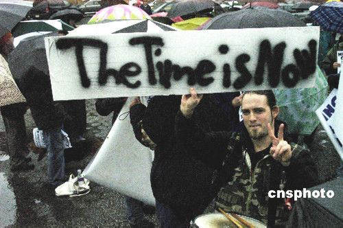 3月19日是美國(guó)對(duì)伊開戰(zhàn)五周年日。在美國(guó)紐約多個(gè)反戰(zhàn)組織以集會(huì)游行的方式要求政府結(jié)束伊戰(zhàn)。圖為在紐約的一個(gè)反戰(zhàn)集會(huì)上,一名美國(guó)青年一手比劃著和平的標(biāo)志,一手舉著標(biāo)語牌,上面寫著:(撤軍的)時(shí)間就是現(xiàn)在。中新社發(fā) 鄧悅 攝