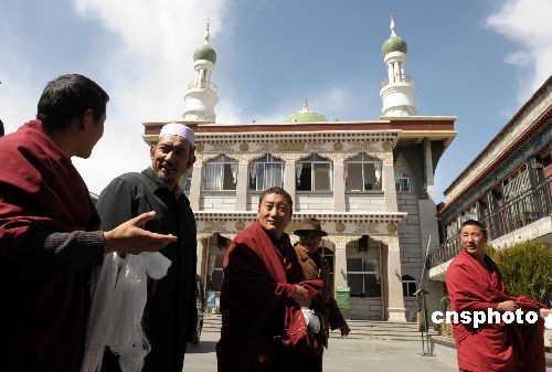 3月22日,拉薩大昭寺的佛教僧人走訪拉薩大清真寺時與阿訇交談。中新社發(fā) 廖攀 攝