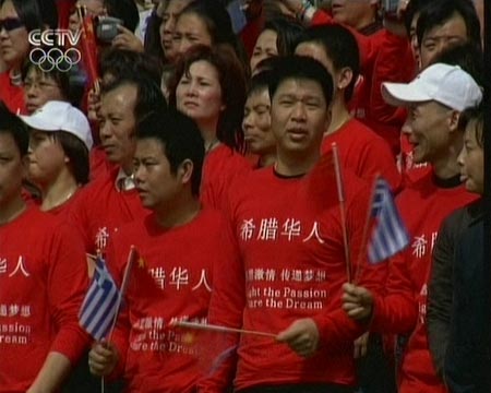 圖:希臘華人在采火現(xiàn)場觀看圣火采集儀式