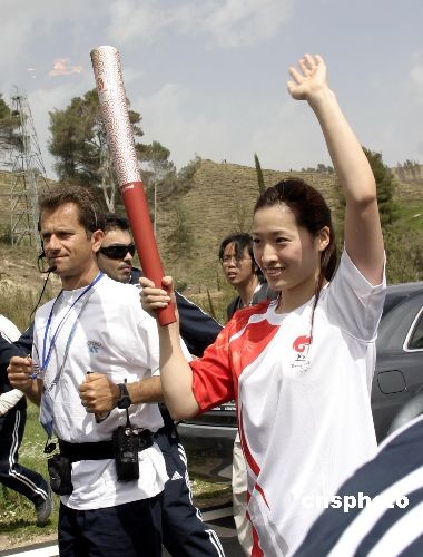 希臘當(dāng)?shù)貢r間3月24日,北京二00八年奧運(yùn)會圣火采集儀式在古奧林匹亞競技場舉行,隨后火炬希臘傳遞開始。第一位中國火炬手羅雪娟一邊傳遞圣火一邊向觀眾揮手致意。中新社發(fā) 王歡 攝