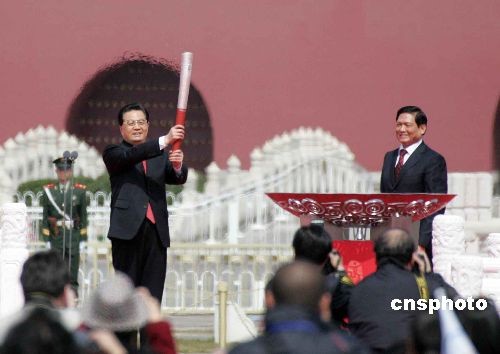 3月31日上午,北京奧運(yùn)會(huì)火炬接力啟動(dòng)儀式在北京天安門廣場(chǎng)舉行,中國(guó)國(guó)家主席胡錦濤舉起點(diǎn)燃的火炬,向在場(chǎng)的觀眾展示,現(xiàn)場(chǎng)爆發(fā)出熱烈的掌聲和歡呼聲。作者: 張宇
