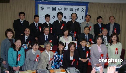 由日本僑報(bào)社日中交流研究所主辦的“第三屆日本人漢語(yǔ)征文比賽”頒獎(jiǎng)典禮暨獲獎(jiǎng)作品集《寄語(yǔ)奧運(yùn)寄語(yǔ)中國(guó)》首發(fā)儀式,3月28日下午在東京日本外國(guó)記者俱樂(lè)部舉行。中國(guó)駐日使館于淑媛總領(lǐng)事代表崔天凱大使,日本民主黨眾議院議員菊田真紀(jì)子、內(nèi)閣府副官房長(zhǎng)官大野松茂自民黨眾議院議員代理日本外務(wù)省地域調(diào)整官井尻和宏、日中友好會(huì)館理事長(zhǎng)村上立躬、日本財(cái)團(tuán)理事長(zhǎng)尾形武壽等各界人士80余人參加。圖為參加頒獎(jiǎng)典禮的獲獎(jiǎng)?wù)吆图钨e合影。 中新社發(fā) 段躍中 攝
