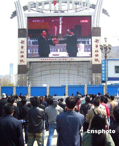 3月31日,北京站旅客在廣場大屏幕前觀看奧運圣火傳遞直播。當(dāng)天,2008奧運圣火啟動儀式在北京天安門廣場隆重舉行,胡錦濤主席親自點燃了北京奧運會圣火,并宣布奧運圣火傳遞正式啟動。北京站前廣場大屏幕直播的盛大場面,吸引了眾多旅客駐足觀看。 中新社發(fā) 玉龍 攝