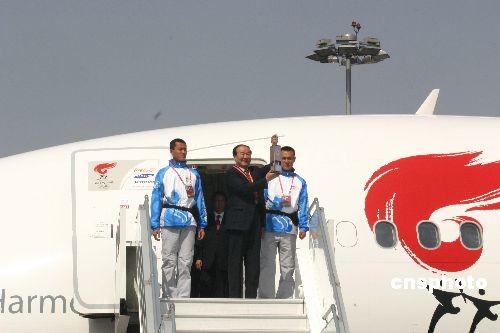 當?shù)貢r間4月1日下午1點13分,北京奧運圣火包機“奧運圣火號”抵達阿拉木圖國際機場。北京奧運會圣火將從那里開始境外傳遞的首航。4月2日,奧運圣火將在阿拉木圖進行六個小時的傳遞。圖為北京奧組委執(zhí)行副主席蔣效愚(中)手提圣火燈走下飛機。 中新社發(fā) 沈晨 攝