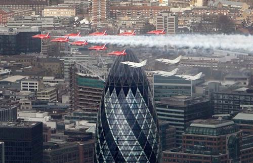 英國皇家空軍4月1日舉行飛行表演,“紅箭”飛行表演隊(duì)的飛機(jī)和4架“臺風(fēng)”戰(zhàn)機(jī)飛過倫敦上空,紀(jì)念皇家空軍建立90周年。