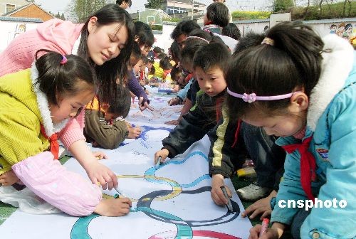 4月2日,江蘇大學(xué)人文學(xué)院50多名大學(xué)生走進(jìn)鎮(zhèn)江市七里甸中心小學(xué),與該校學(xué)生一起開展“大小學(xué)子共繪奧運(yùn)畫卷”活動,學(xué)子們在百米長卷上共同繪制了奧運(yùn)福娃、五環(huán)標(biāo)志和各類運(yùn)動項目等圖案,表達(dá)他們對北京奧運(yùn)會的期盼和祝愿。作者: 石玉成