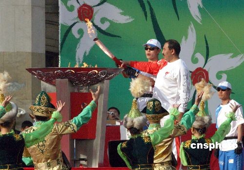 4月2日,北京奧運會的火炬?zhèn)鬟f于中午12時從阿拉木圖麥迪奧山大壩出發(fā),五個小時后在阿斯塔納廣場舉行慶典活動。這是奧運圣火首次來到哈薩克斯坦,當?shù)貙κセ饌鬟f相當重視。圖為當天最后一位火炬手、2000年奧運會拳擊冠軍葉爾馬罕·伊布拉莫夫用手中的火炬點燃圣火盤。這預示著北京奧運圣火境外傳遞首站火炬?zhèn)鬟f落幕。 中新社發(fā) 沈晨 攝
