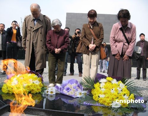 4月4日清明節(jié),在侵華日軍南京大屠殺遇難同胞紀念館祭場內,日本銘心會友好訪華團團長松岡環(huán)(右二)、旅日華僑中日交流促進會秘書長林伯耀(左一)等百名日中友好人士抔土獻菊,祭掃南京大屠殺三十萬遇難者。中新社發(fā) 朱曉穎 攝