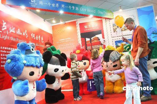 4月6日,由北京對外文化交流中心、北京月訊雜志社聯(lián)合北京奧組委新聞宣傳部舉辦的奧運(yùn)主題展覽在首屆北京旅居人士服務(wù)展覽會國貿(mào)廳亮相,吸引了大量外國朋友駐足拍照留念。這次“奧運(yùn)火炬?zhèn)鬟f”展覽以“魅力北京、奧運(yùn)之城、和諧之旅”為主題,為中外友人提供認(rèn)識北京、了解北京奧運(yùn)的平臺。中新社發(fā) 追影 攝