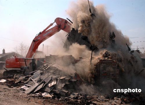 4月8日,黑龍江省黑河市城市管理行政執(zhí)法局及有關(guān)部門對東部棚戶區(qū)部分拒不履行搬遷義務(wù)的被拆遷戶依法定程序?qū)嵤⿵?qiáng)制拆遷。中新社發(fā) 邱齊龍 攝