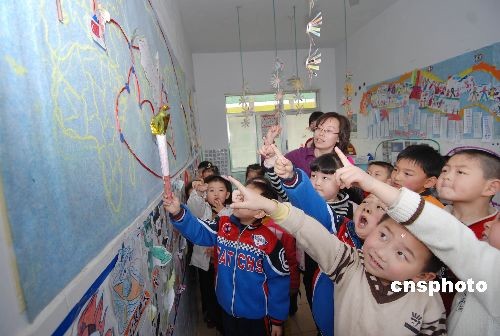 4月8日,山東濰坊市奎文區(qū)新華幼兒園師生正在自己親手制作的奧運圣火線路圖前,喊出對圣火的祝福。令世人矚目的奧運圣火傳遞,同樣也牽動著孩子們的心,山東濰坊市奎文區(qū)新華幼兒園的孩子們在老師的指導下制作了一面“奧運墻”,內(nèi)容有奧運圣火的傳遞路線,還有奧運會運動項目圖解等,孩子們每天都關(guān)注著奧運圣火的傳遞,關(guān)注著奧運。作者: 王立軍