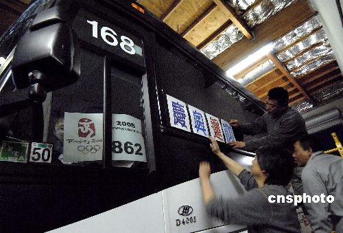 當(dāng)?shù)貢r(shí)間四月八日夜間,舊金山華人在裝扮最后一批大巴,準(zhǔn)備迎接北京奧運(yùn)圣火。九日,當(dāng)?shù)貙⒂薪佥v大巴運(yùn)送萬(wàn)余名華人華僑到舊金山參加迎看北京奧運(yùn)圣火傳遞活動(dòng)。作者: 陳鋼
