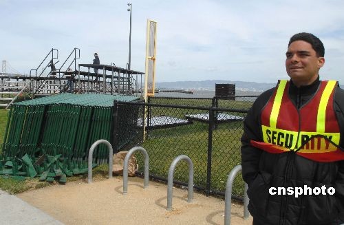 當(dāng)?shù)貢r(shí)間四月八日,一名保安人員在舊金山中國(guó)灣公園執(zhí)勤。北京奧運(yùn)火炬舊金山站傳遞活動(dòng)開(kāi)幕儀式九日將在這里舉行,開(kāi)幕式所用舞臺(tái)基本搭建完成。作者: 張煒