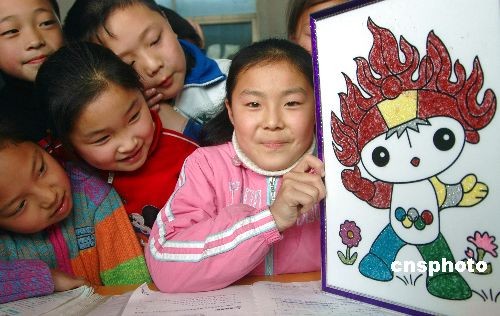 圖:河南社旗留守兒童手繪福娃祝福奧運