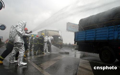 2008年4月9日,在濟(jì)青高速公路零公里處,山東省高速公路交警支隊(duì)聯(lián)合消防、醫(yī)療救護(hù)、環(huán)保等單位舉行了“迎奧運(yùn)、保暢通”模擬交通事故救援演練。演練模擬在濟(jì)青高速公路零公里處,一輛油罐車與一輛貨車發(fā)生碰撞,油罐車起火,隨時(shí)都有爆炸的可能。而后面的貨車因猛烈撞擊,造成駕駛室嚴(yán)重變形,駕乘人員被困車內(nèi)。山東省高速公路交警支隊(duì)接到報(bào)警后,迅速趕到現(xiàn)場(chǎng)進(jìn)行處理,同時(shí)啟動(dòng)重特大交通事故處置聯(lián)動(dòng)機(jī)制,及時(shí)通知消防、醫(yī)療救護(hù)、環(huán)保等部門聯(lián)動(dòng),并在30分鐘內(nèi)將火勢(shì)控控制,救治被困受傷人員,恢復(fù)車輛正常通行。作者: 龔輝