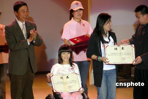 四月十日,中國首枚冬奧會(huì)金牌獲得者揚(yáng)揚(yáng)、前體操運(yùn)動(dòng)員桑蘭和中國相聲名家馮鞏被聘為北京奧運(yùn)會(huì)、殘奧會(huì)文明觀眾、拉拉隊(duì)隊(duì)長。圖右為楊揚(yáng)從北京奧組委志愿者部部長劉劍手中接過聘書。作者: 沈嘉