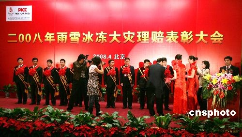中國人民財(cái)產(chǎn)保險(xiǎn)股份有限公司(PICC)在北京舉行2008年雨雪冰凍大災(zāi)理賠表彰大會(huì),對(duì)該公司在此次大災(zāi)理賠工作中取得突出成績的單位(集體)和個(gè)人進(jìn)行表彰。中新社發(fā) 楊可佳 攝