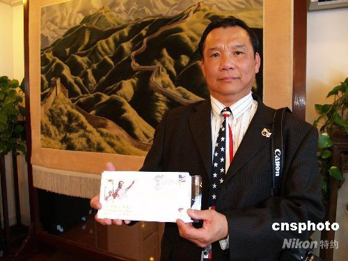 4月13日,美國郵政局發(fā)行“2008年北京奧運圣火傳遞舊金山首日封”。這枚首日封由華人設(shè)計師魏進(jìn)發(fā)設(shè)計。中新社發(fā) 盧威 攝