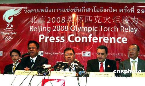 4月17日,泰國(guó)奧委會(huì)在國(guó)家體育館就奧運(yùn)火炬?zhèn)鬟f活動(dòng)舉行新聞發(fā)布會(huì)。泰國(guó)奧委會(huì)主席育塔薩先生(中)表示,曼谷為迎接北京奧運(yùn)會(huì)圣火已經(jīng)做好一切準(zhǔn)備。曼谷的火炬?zhèn)鬟f活動(dòng)將在當(dāng)?shù)貢r(shí)間19日下午三點(diǎn)開(kāi)始;鹁鎸穆忍迫私——耀華叻路起跑,途經(jīng)富有泰國(guó)民族文化特色的地點(diǎn),如大王宮、王家田廣場(chǎng)、民主紀(jì)念碑、五世王紀(jì)念廣場(chǎng)等,全程約10公里。 作者: 顧時(shí)宏