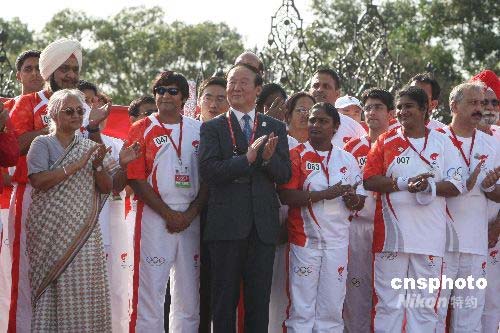 4月17日下午,北京奧運圣火傳遞活動在新德里印度總統(tǒng)府和印度門之間的拉吉大街上進行。70名火炬手沿著這條三公里長的大街傳遞圣火。圖為北京奧組委執(zhí)行副主席蔣效愚出席北京奧運圣火新德里傳遞起跑儀式。作者: 沈晨