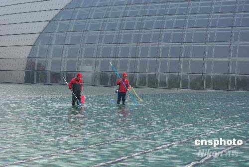 4月17日,工人們正在清除國家大劇院人工湖中的柳絮和沉物。這是2008年第一次清洗大劇院的水池,整個(gè)清洗工作將持續(xù)30天左右。 國家大劇院的人工湖面積達(dá)到35000平方米,湖水深40厘米—50厘米,人工湖環(huán)抱著國家大劇院,空中鳥瞰湖面呈不規(guī)則橢圓形。中新社發(fā) 九州 攝