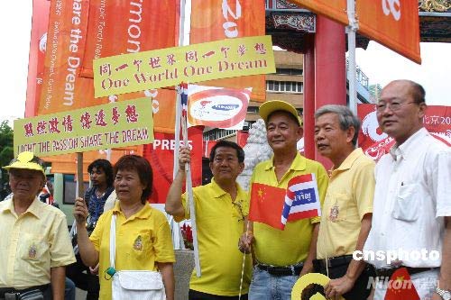 4月19日下午3時(shí)15分,祖籍中國(guó)海南的泰國(guó)第二代華裔阿南·詩里帕差臘蓬從曼谷市市長(zhǎng)阿皮拉手中接過“祥云”火炬,北京奧運(yùn)圣火在此間的傳遞正式開始。北京奧運(yùn)圣火在曼谷的傳遞約10.8公里,共有80名火炬手,其中泰籍華人占一半以上;鹁孀蕴迫私种腥A門出發(fā)后,途經(jīng)臥佛寺、大王宮、民主紀(jì)念碑、集拉達(dá)王宮、阿南達(dá)王宮等曼谷著名景點(diǎn)后,最終在五世王銅像廣場(chǎng)舉行慶典儀式。圖為華人華僑在圣火傳遞沿途舉牌助威。 中新社發(fā) 沈晨 攝