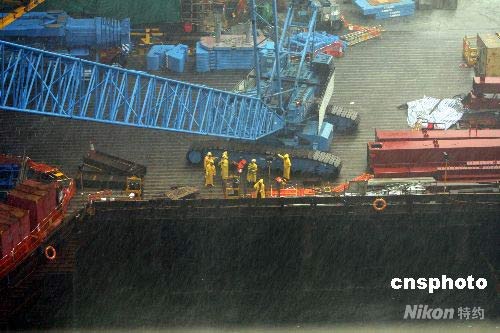 在會(huì)展中心擴(kuò)建工地上施工人員冒雨工作。中新社發(fā) 洪少葵 攝
