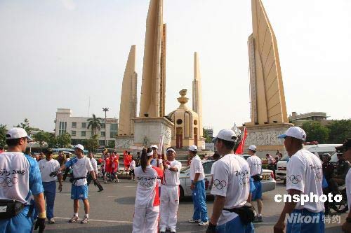 十九日的曼谷,一場喜雨后是高達(dá)三十四度的氣溫,而比這溫度更高的是富有熱帶風(fēng)情的曼谷今天迎來奧運圣火首次在“佛都”傳遞的熱潮。從火炬?zhèn)鬟f起點唐人街到大皇宮、玉佛寺、吉拉達(dá)皇宮、民族紀(jì)念碑、拉瑪五世廣場等泰國著名景點道路兩旁早已被裝扮一新。除了“點燃激情,傳遞夢想”等奧運標(biāo)語和橫額外,姹紫嫣紅的熱帶花卉點綴著長達(dá)十點五公里的火炬?zhèn)鬟f全線,“圣火花中行”成為曼谷圣火傳遞的一大特色。圖為泰國火炬?zhèn)鬟f手順利在民族紀(jì)念碑前交接火炬。 顧時宏 攝
