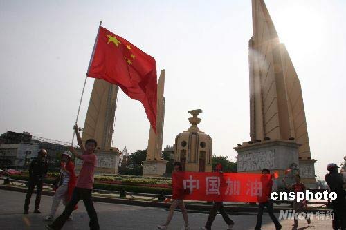 曼谷市中心的民族紀念碑被前來給火炬?zhèn)鬟f助威的中國留學(xué)生、華人華僑與當?shù)厥忻駠盟共煌ǎ巳硕家砸欢脢W運圣火為快。圖為留學(xué)生高舉國旗經(jīng)過曼谷民族紀念碑。 顧時宏 攝