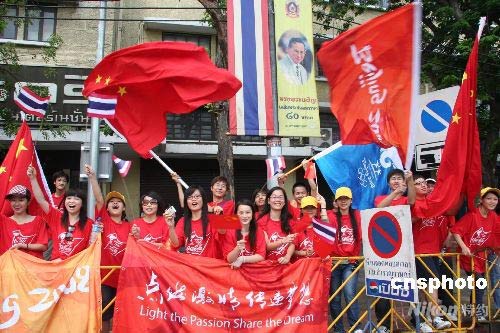 圖為中國(guó)留學(xué)生高舉國(guó)旗為曼谷奧運(yùn)圣火傳遞搖旗吶喊:“中國(guó)!加油!北京奧運(yùn)一定成功!”。 顧時(shí)宏 攝