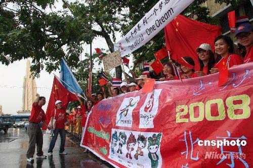 圖為中國(guó)留學(xué)生高舉國(guó)旗為曼谷奧運(yùn)圣火傳遞搖旗吶喊:“中國(guó)!加油!北京奧運(yùn)一定成功!”。 顧時(shí)宏 攝
