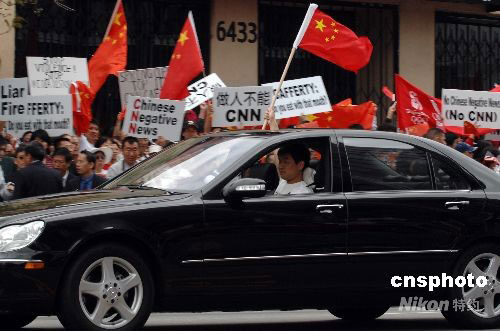 當(dāng)?shù)貢r(shí)間4月19日上午,一名抗議者一手揮舞五星紅旗、一手緊握方向盤駕車經(jīng)過(guò)示威現(xiàn)場(chǎng)。洛杉磯當(dāng)天爆發(fā)十幾年來(lái)最大規(guī)模的華人華僑抗議示威活動(dòng)。數(shù)千名華人華僑和留學(xué)生在CNN洛杉磯分部門前參加和平示威,要求CNN向公開(kāi)鄭重道歉,并開(kāi)除卡弗蒂。中新社發(fā) 張煒 攝