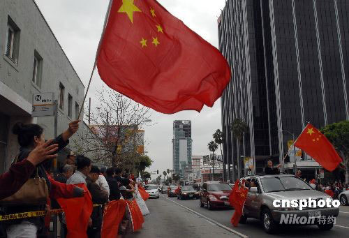 當(dāng)?shù)貢r間4月19日,洛杉磯爆發(fā)十幾年來最大規(guī)模的華人華僑抗議示威活動。數(shù)千名華人華僑和留學(xué)生在CNN洛杉磯分部門前參加和平示威,要求CNN向公開鄭重道歉,并開除卡弗蒂。圖為抗議者駕車揮舞五星紅旗。中新社發(fā) 張煒 攝