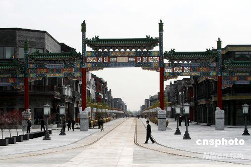 2008年4月21日,北京前門大街改造工程基本修整完畢,其正陽門及兩旁的建筑已展露出較強的明清時代的風韻。今年“五一”,前門步行街將對游人開放。中新社發(fā) 任丘 攝